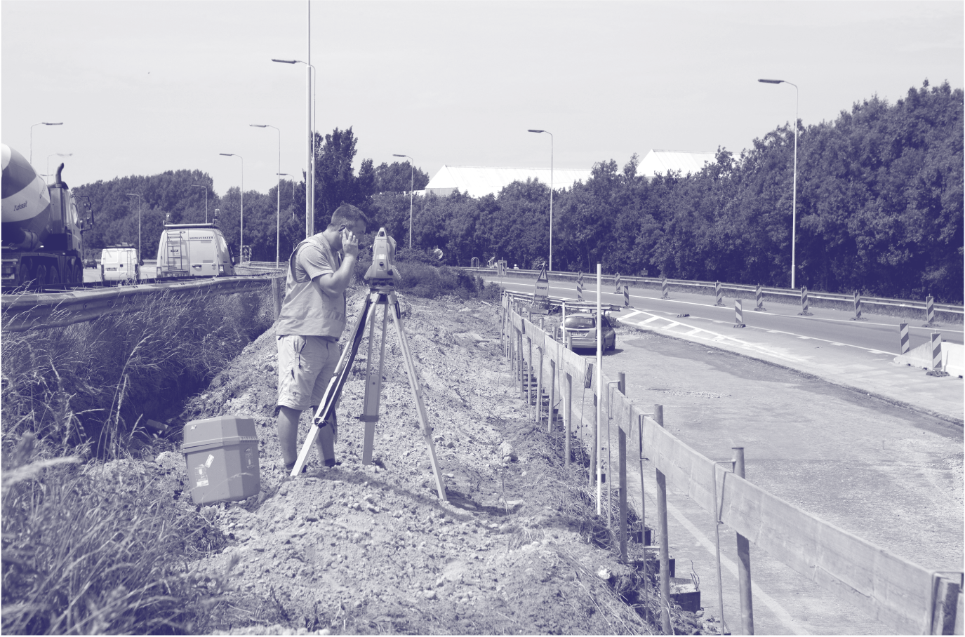 Wegwerkers gebruiken een theodoliet om de loop van een weg nauwkeurig te bepalen.