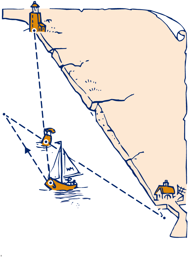 Evelien zeilt in haar bootje evenwijdig aan de kust. Ze wil weten hoe snel ze vaart. Op een gegeven moment ziet ze de brulboei en de vuurtoren in één lijn. Ze is dan meter van de boei af. Na drie minuten varen ziet ze achter zich de haven en de boei in één lijn. Op haar kaart ziet ze dat de brulboei meter van de vuurtoren ligt en dat de afstand van de haven tot de vuurtoren meter is.