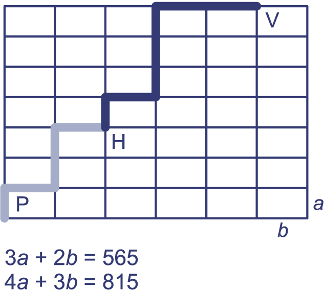 Paul fietst van zijn huis (punt P) naar zijn vriend Hans (punt H). Volgens de kilometerteller van Paul is de lengte van deze route 565 meter. Samen moeten Paul en Hans nog 815 meter fietsen naar de voetbalclub (punt V). In de plattegrond is de route gekleurd die Paul fietst.