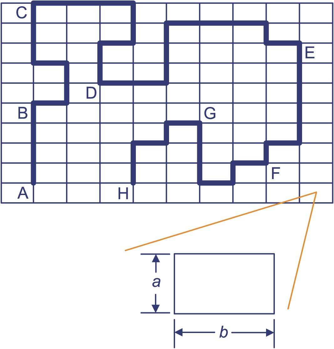 In figuur 1 is de route AC gekleurd. Ines loopt die route elke morgen heen en terug en 's middags weer. Dagelijks legt zij dus een lengte van of korter af. Je kunt de lengte van die route ook zonder haakjes schrijven in de vorm: .