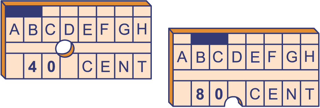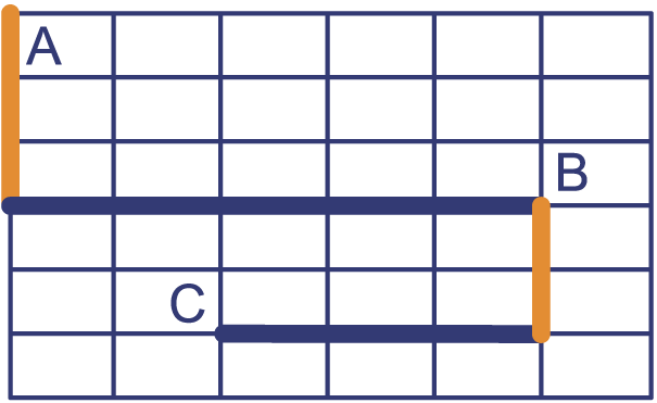 Ines stapt bij halte A op de bus en reist naar B. Dit kost haar 40 cent. Wat later reist ze van B naar C. Dit kost 80 cent. De prijs van een kaartje hangt alleen af van het aantal korte stukjes (dat zijn de stukjes met lengte ) en het aantal lange stukjes (dat zijn de stukjes met lengte ) in de rit.