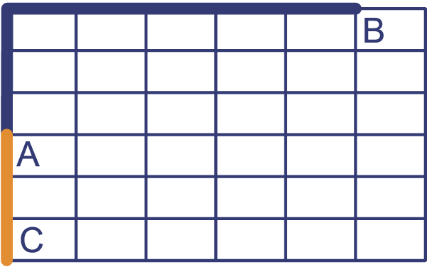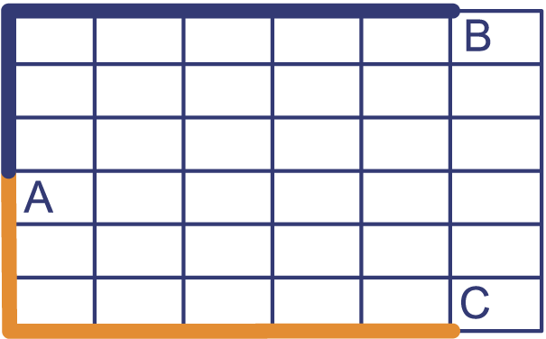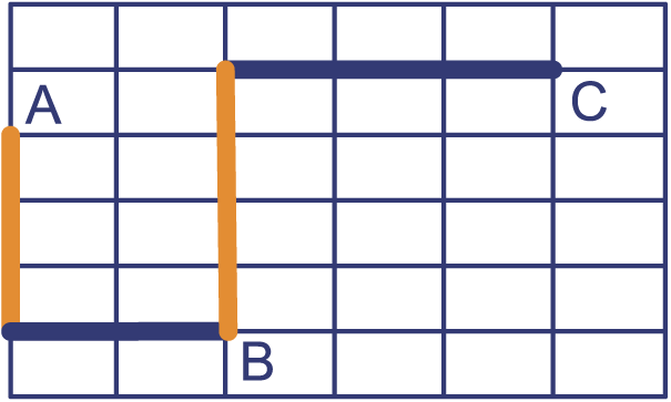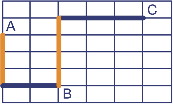 In de plattegrond is een route getekend die punt A met punt C verbindt. De lengte van de route AB is . De lengte van de route BC is . De lengte van de route AC is .