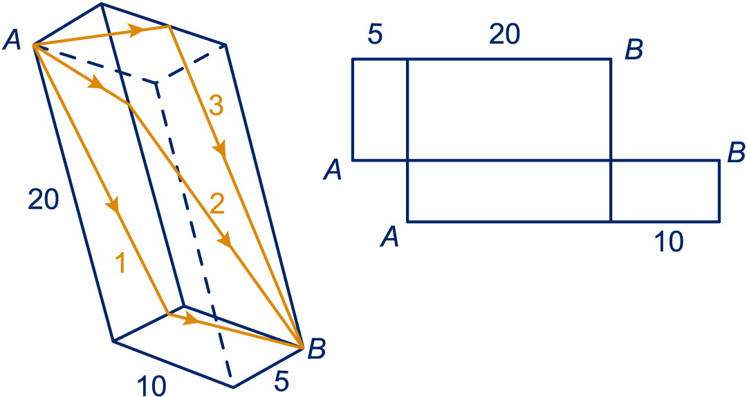 Een mier loopt over grensvlakken van naar . Hij wil een zo kort mogelijke route lopen. In de ruimtelijke tekening zie je drie mogelijkheden.