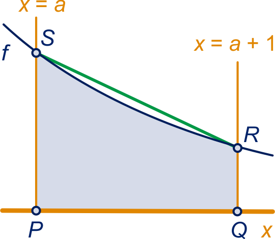 Gegeven is de functie met . De lijn snijdt de -as in en de grafiek van in . De lijn snijdt de -as in en de grafiek van in . Het gebied begrensd door de grafiek van en de lijnstukken , en noemen we . Het trapezium noemen we , zie figuur.