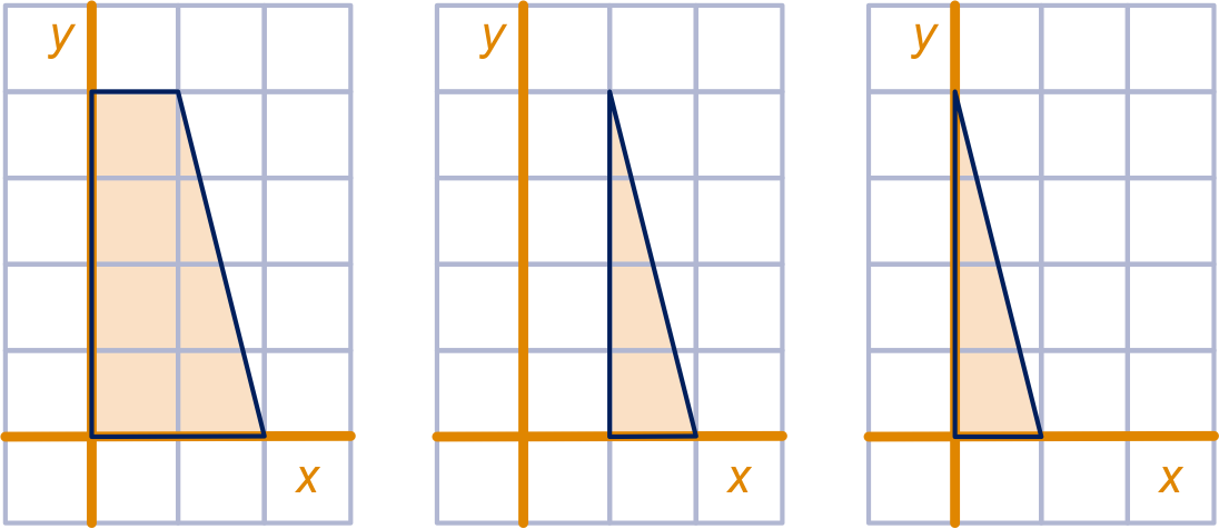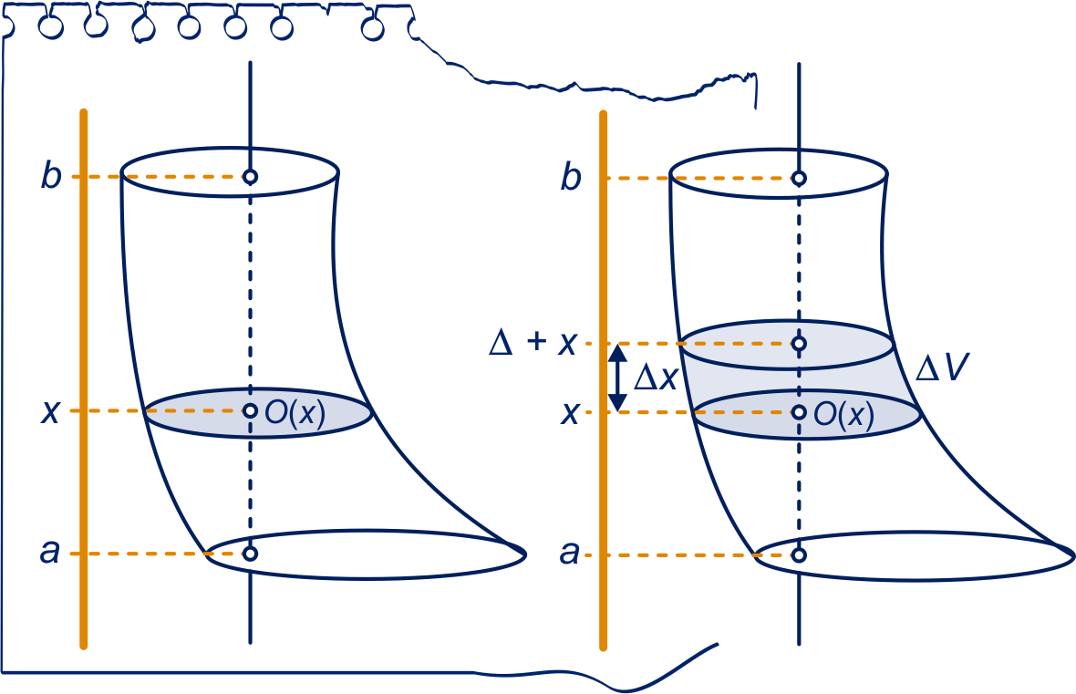 In de figuur hieronder zijn drie vlakdelen getekend die om de -as gewenteld worden. Het linker vlakdeel is een trapezium met hoekpunten , , en . Het vlakdeel in het midden is een driehoek met hoekpunten , en . Het vlakdeel rechts is een driehoek met hoekpunten , en .