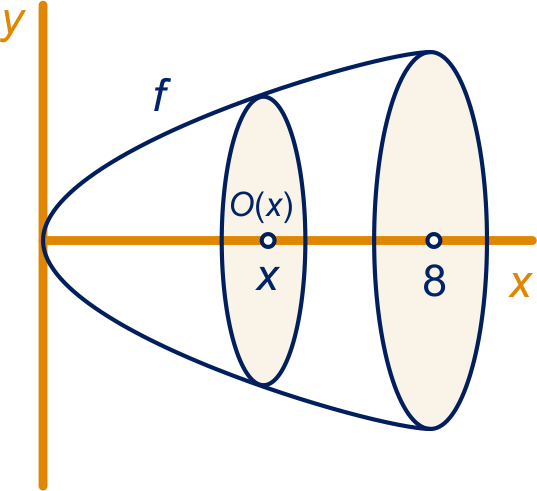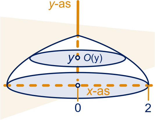 Het omwentelingslichaam in de figuur krijg je door het vlakdeel ingesloten door de -as, de -as en de grafiek van met te wentelen om de -as. De oppervlakte van het lichaam op hoogte noemen we .