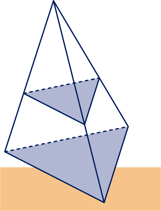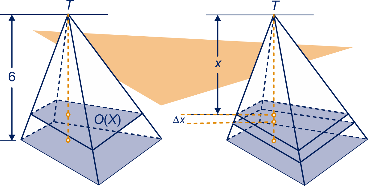 De top van de piramide noemen we . Het grondvlak van de piramide heeft oppervlakte . Elk vlak evenwijdig aan het grondvlak doorsnijdt de piramide volgens een vlak dat gelijkvormig met het grondvlak is. De oppervlakte van de doorsnede op afstand van noemen we .