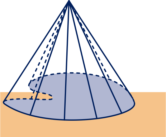 Bekijk figuur 2 hierboven. Daar wordt een punt met rechte verbindingslijntjes verbonden met de randen van een vlak gebied. De figuur die zo ontstaat noemen we piramide-achtig. Een voorbeeld van een piramide-achtige figuur is bijvoorbeeld een kegel. Noem de hoogte van de piramide-achtige figuur en de oppervlakte van het grondvlak . Omdat de oppervlakte van de doorsnede op eenheden van de top ook is, geldt de formule uit d ook voor deze figuur.
