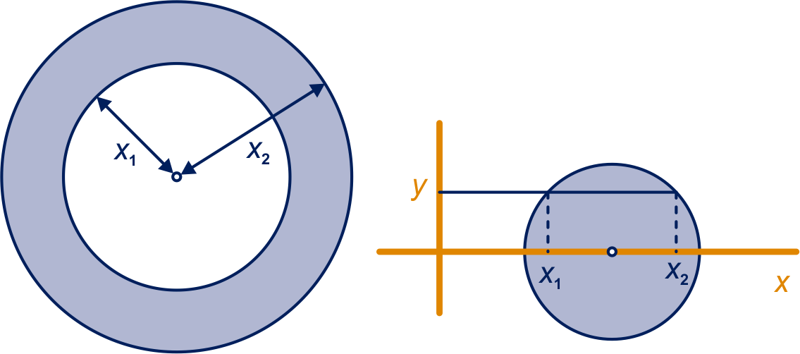 De doorsnede op hoogte is een gebied tussen twee concentrische cirkels, de een met straal en de ander met straal .