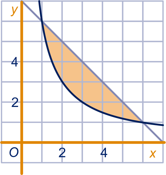 De lijn en de hyperbool sluiten een gebied in, zie figuur.