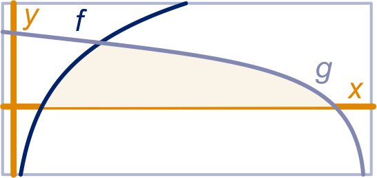 In de figuur is het gebied ingesloten door de -as en de grafieken van en gekleurd.
