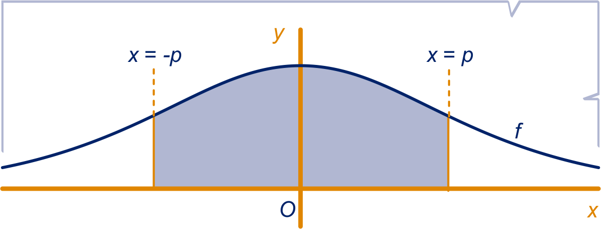 De functie wordt gegeven door . De grafiek van is symmetrisch ten opzichte van de -as. Gegeven is , met . In de figuur is het gebied dat wordt ingesloten door de grafiek van , de -as en de lijnen met vergelijking en gekleurd.