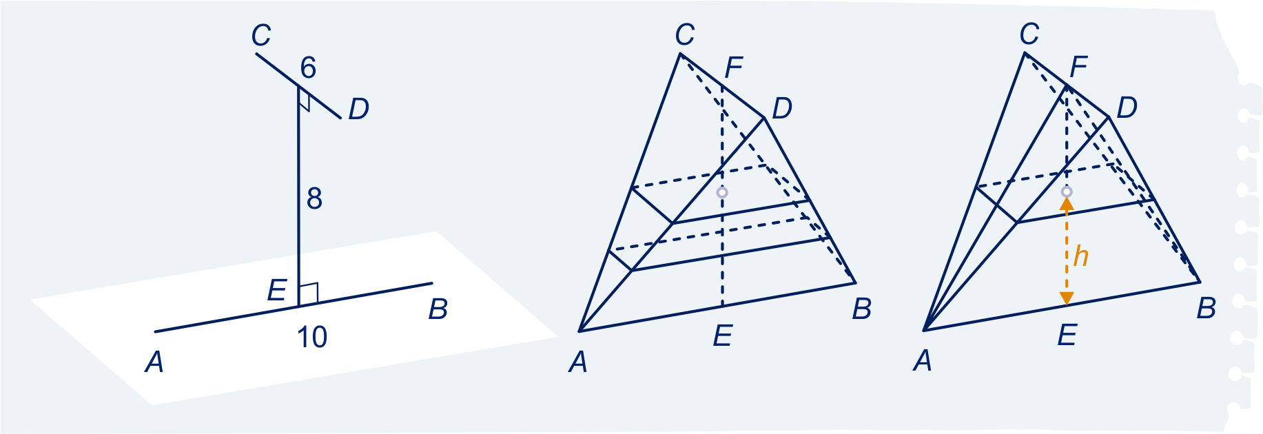 Lijnstuk ligt in een horizontaal vlak. Lijnstuk is evenwijdig aan dat vlak, op afstand . Lijnstuk heeft lengte en lijnstuk heeft lengte . De lijnstukken en staan loodrecht op elkaar. en zijn de middens van en . staat loodrecht op en op . Zie figuur. Door de punten en te verbinden met de punten en ontstaat het viervlak . In het viervlak brengen we horizontale doorsneden aan. Omdat en loodrecht op elkaar staan, zijn de doorsneden rechthoeken.