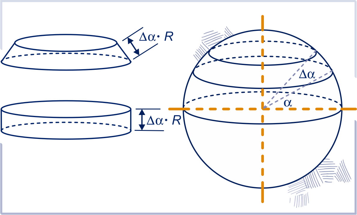 We veranderen een beetje met . De oppervlakte van de bol tussen de hoogten bij en is, omdat klein is, goed te benaderen door de oppervlakte van de zijkant van een cilinder met hoogte en straal .